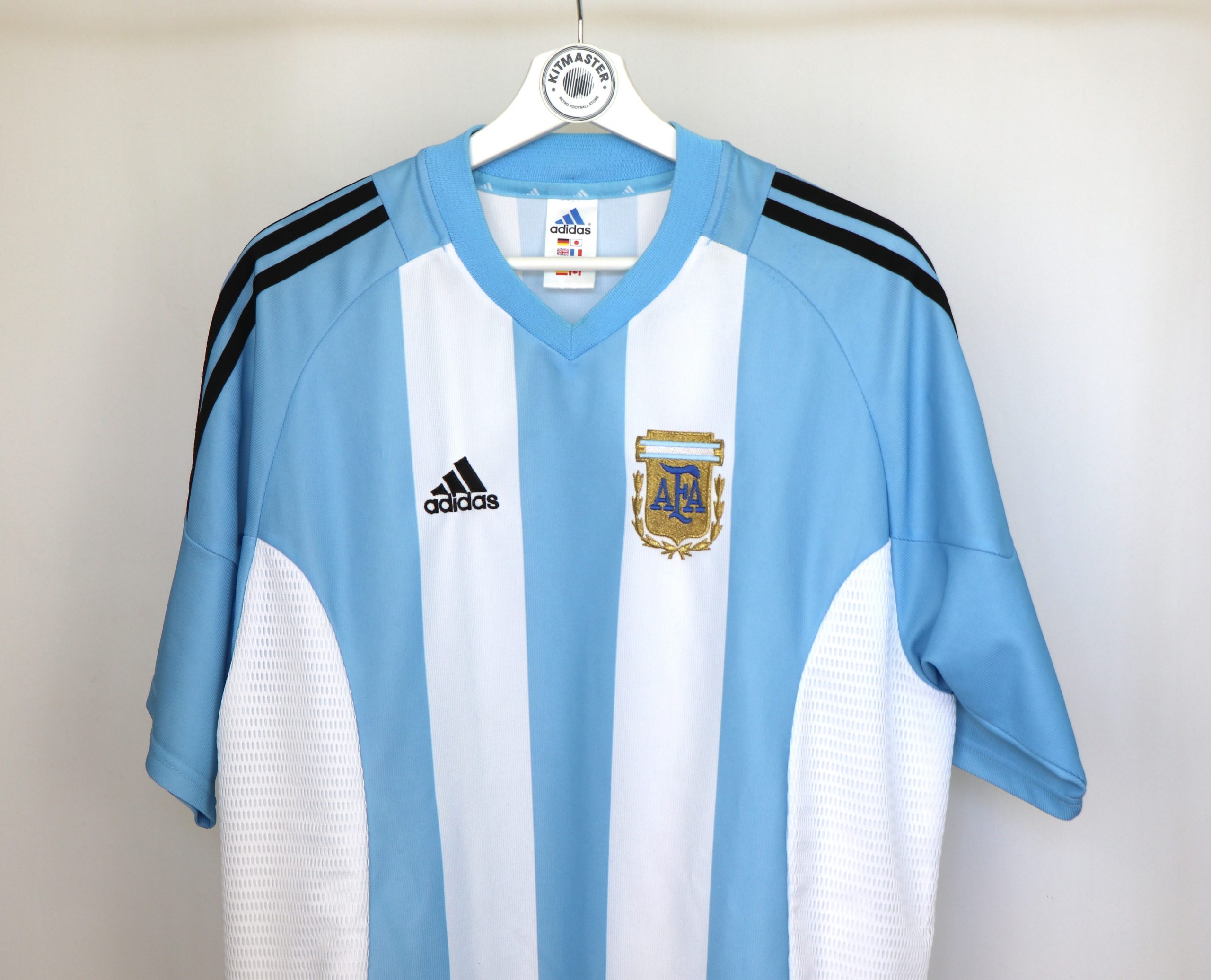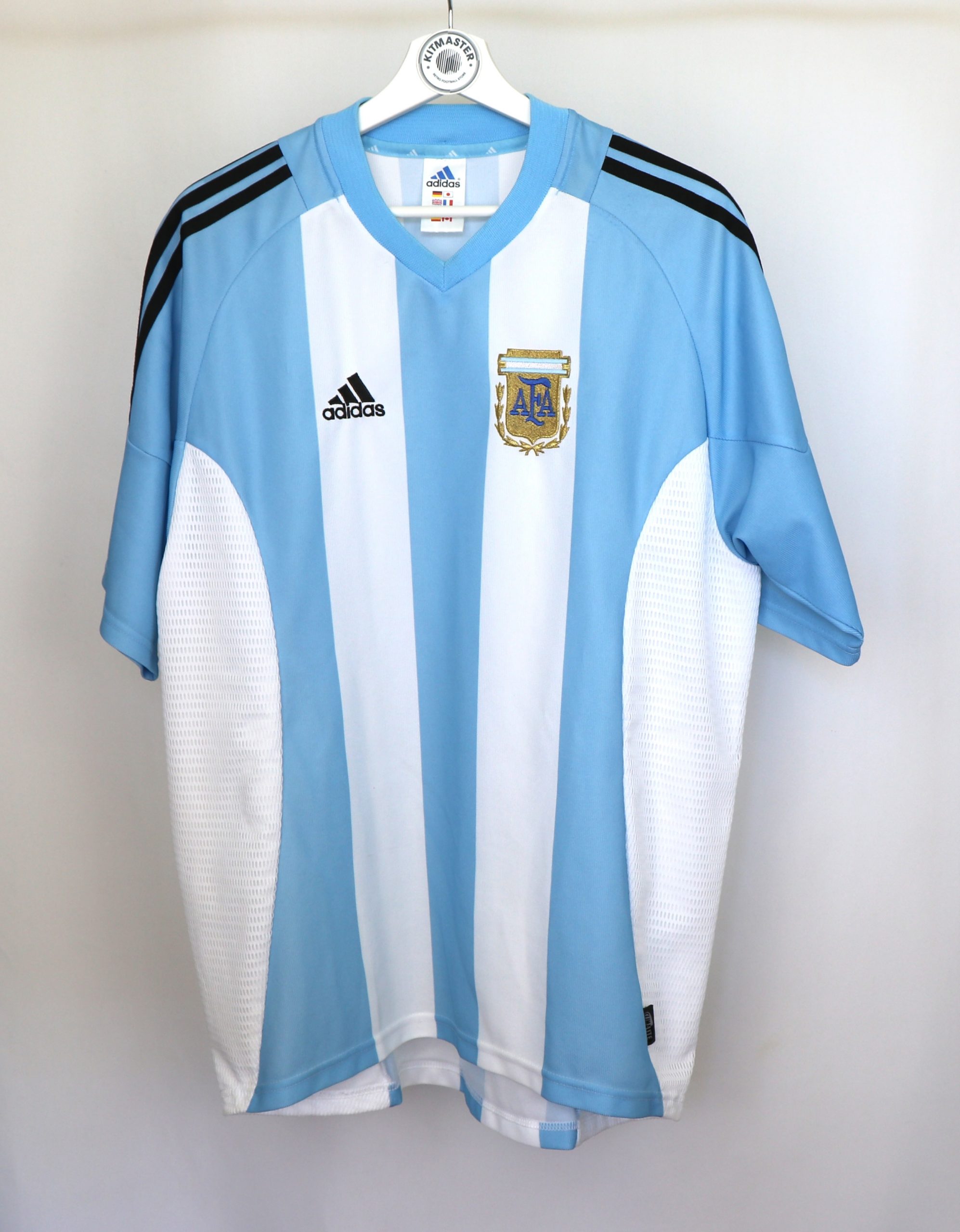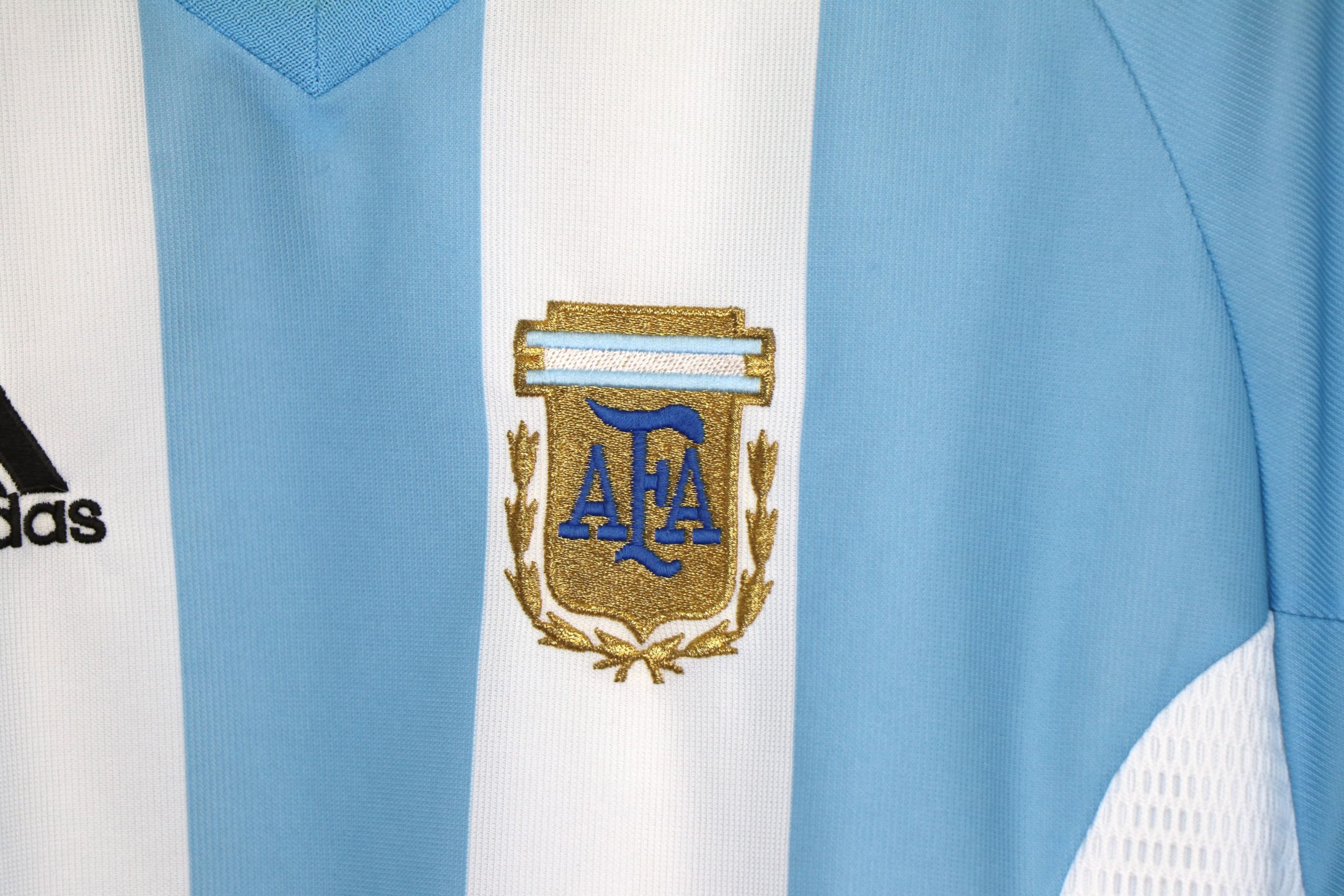Maillot domicile de l’Argentine 2002/04. L’Albiceleste du sélectionneur Marcelo Bielsa se qualifie aisément pour la Coupe du Monde 2002 au Japon et en Corée du Sud. Mais placée dans le « groupe de la mort » l’Argentine, pourtant l’une des favorites de la compétition, va se retrouver éliminée dès la phase de poule après une victoire contre le Nigéria, une défaite contre l’Angleterre et un nul contre la Suède.